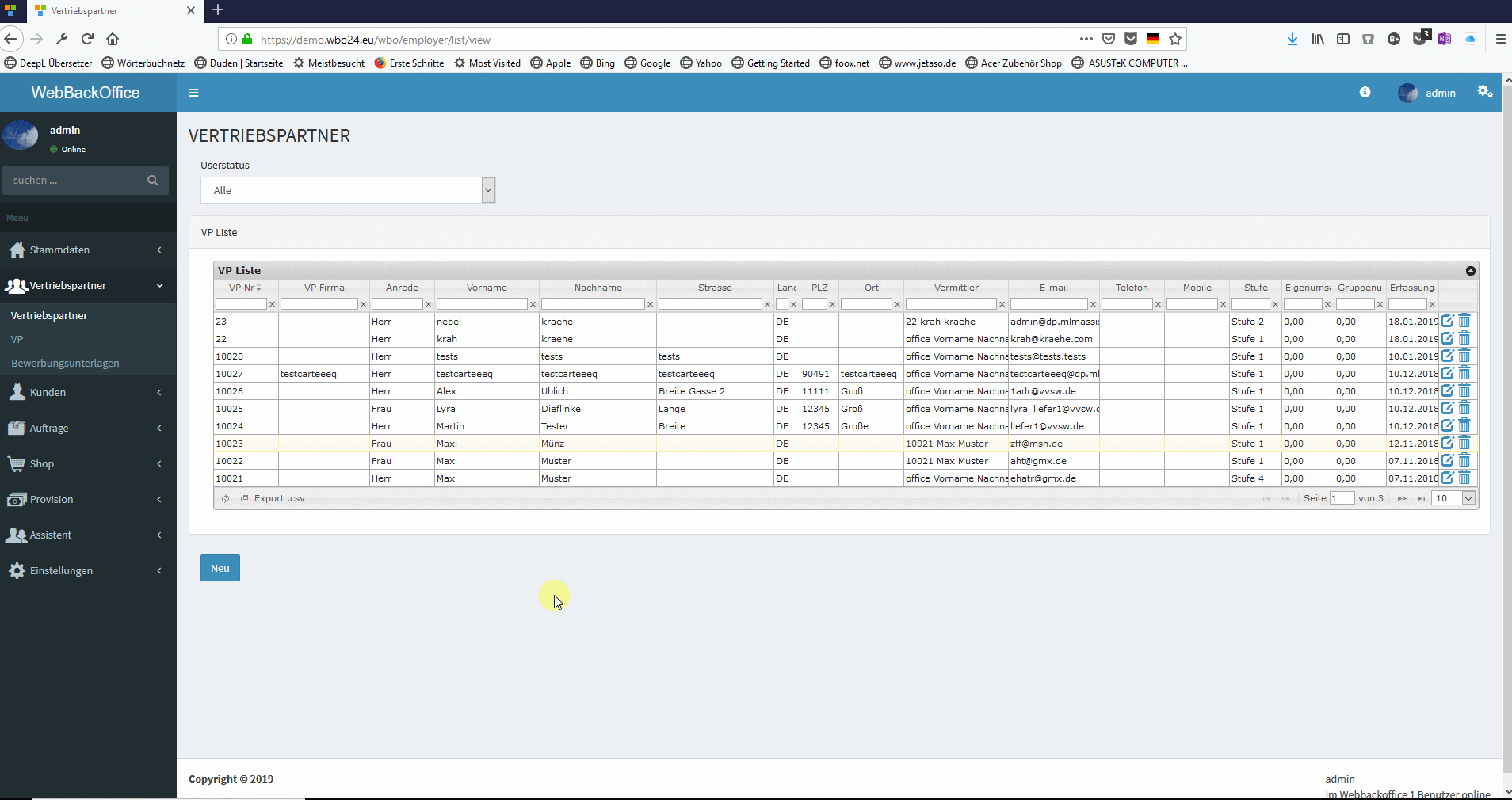 - Verwenden Sie die Filter oben, um spezifisch nach Kunden, Vertriebspartnern oder Datumsbereichen zu suchen.