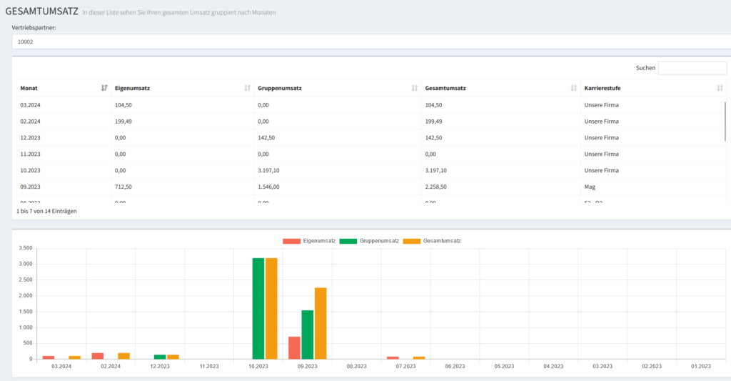 Für eine klare und strukturierte Übersicht teilt sich die Statistik pro Monat in einzelne Zeilen auf, die jeweils den Eigenumsatz, den Gruppenumsatz, den Gesamtumsatz sowie die aktuelle Karrierestufe eines Partners anzeigen. Dies ermöglicht es, die Performance über verschiedene Monate hinweg direkt zu vergleichen.
