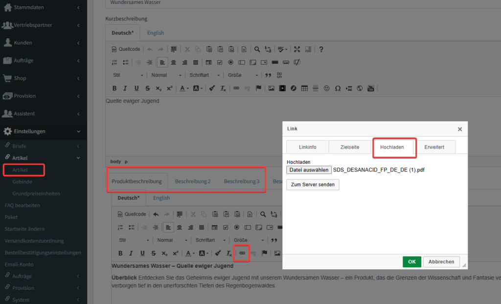 - Im unteren Bereich sehen Sie den Bereich „Produktbeschreibung / Beschreibung 2 / Beschreibung 3 …“.