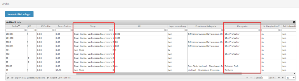 Im nächsten Schritt richten Sie Ihre Aufmerksamkeit auf die Spalte SHOP innerhalb der Produktübersicht. Diese Spalte gibt Aufschluss darüber, ob das Produkt für die Anzeige im Online-Shop freigegeben ist und welchem Shop-Typ es zugeordnet wurde. Die Standard-Shop-Typen sind wie folgt definiert: