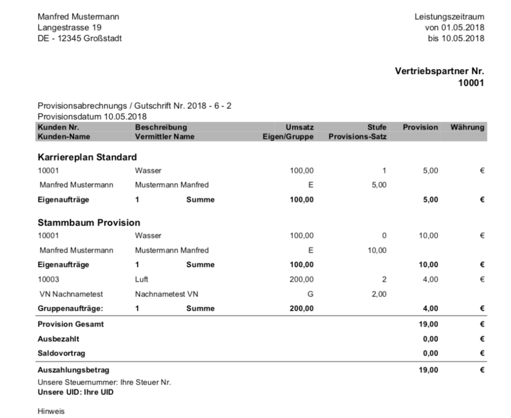 Auf dem Provisionsbeleg wird oben links der Name und die Adresse des Vertriebspartners angezeigt.