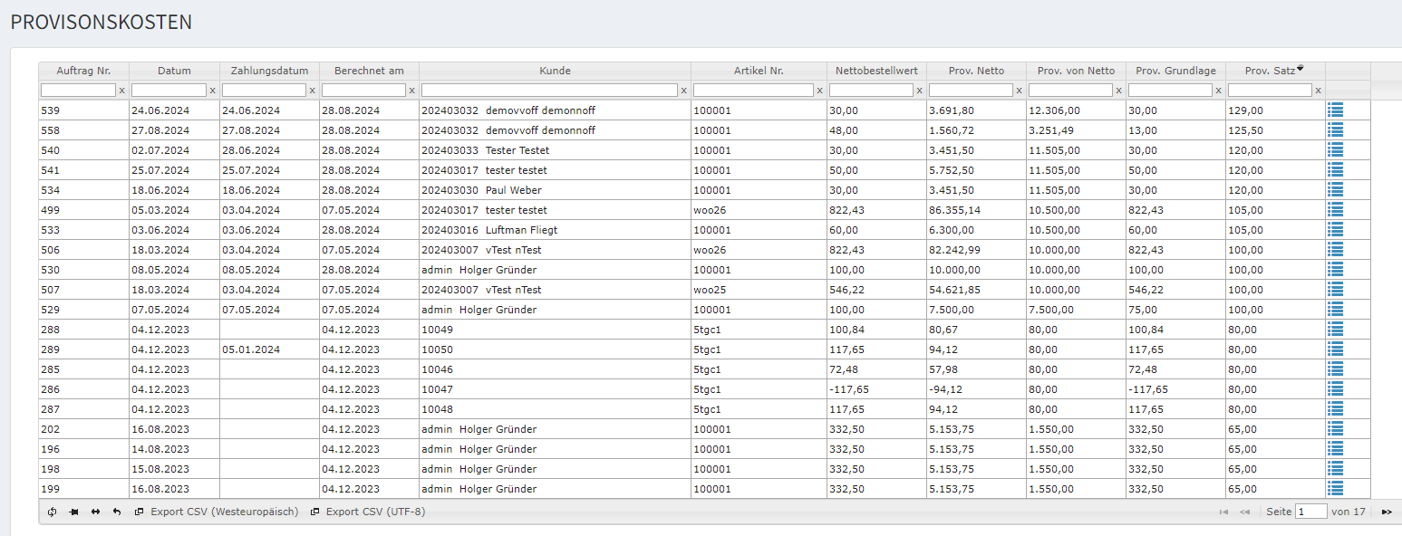 - Prov. von Netto: Prozentualer Anteil der Provision im Verhältnis zum Nettobestellwert (Prov. Netto / Nettobestellwert in Prozent).