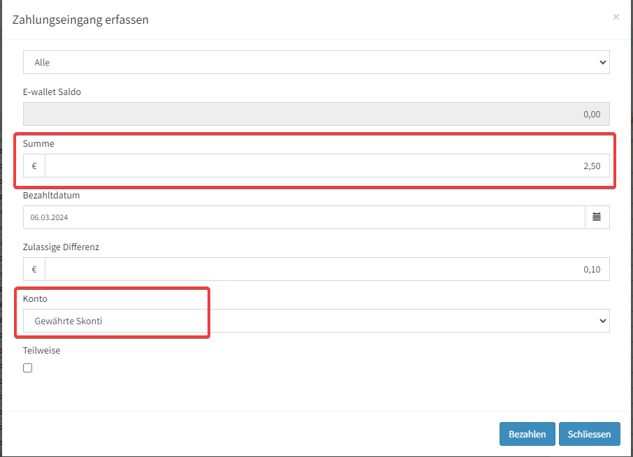 - Skontobetrag verbuchen: Im nächsten Schritt erfassen Sie den Skontobetrag. Dieser Betrag wird ebenfalls als "bezahlt" verbucht, jedoch mit der Zuordnung zum vorher angelegten Konto "Gewährtes Skonto".