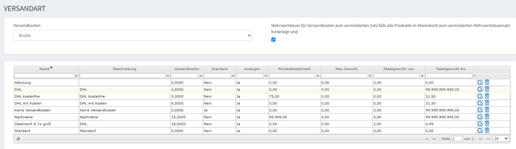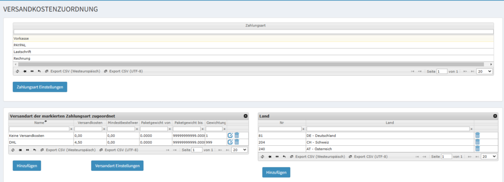 Menü: Einstellungen → Shop → Versandkosten (Versandkostenzuordnung)