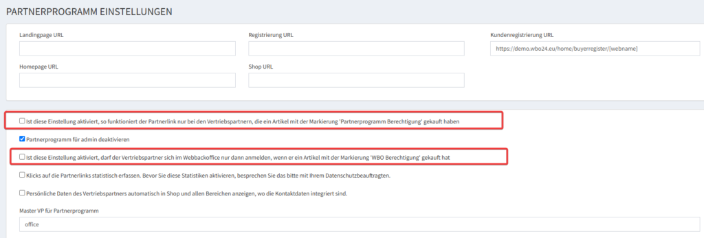Pfad: Einstellungen - Artikel → Artikel- „Partnerprogramm Berechtigung“ (wirkt auf den Partnerlink)„WBO Berechtigung“ (wirkt auf den WBO‑Login)